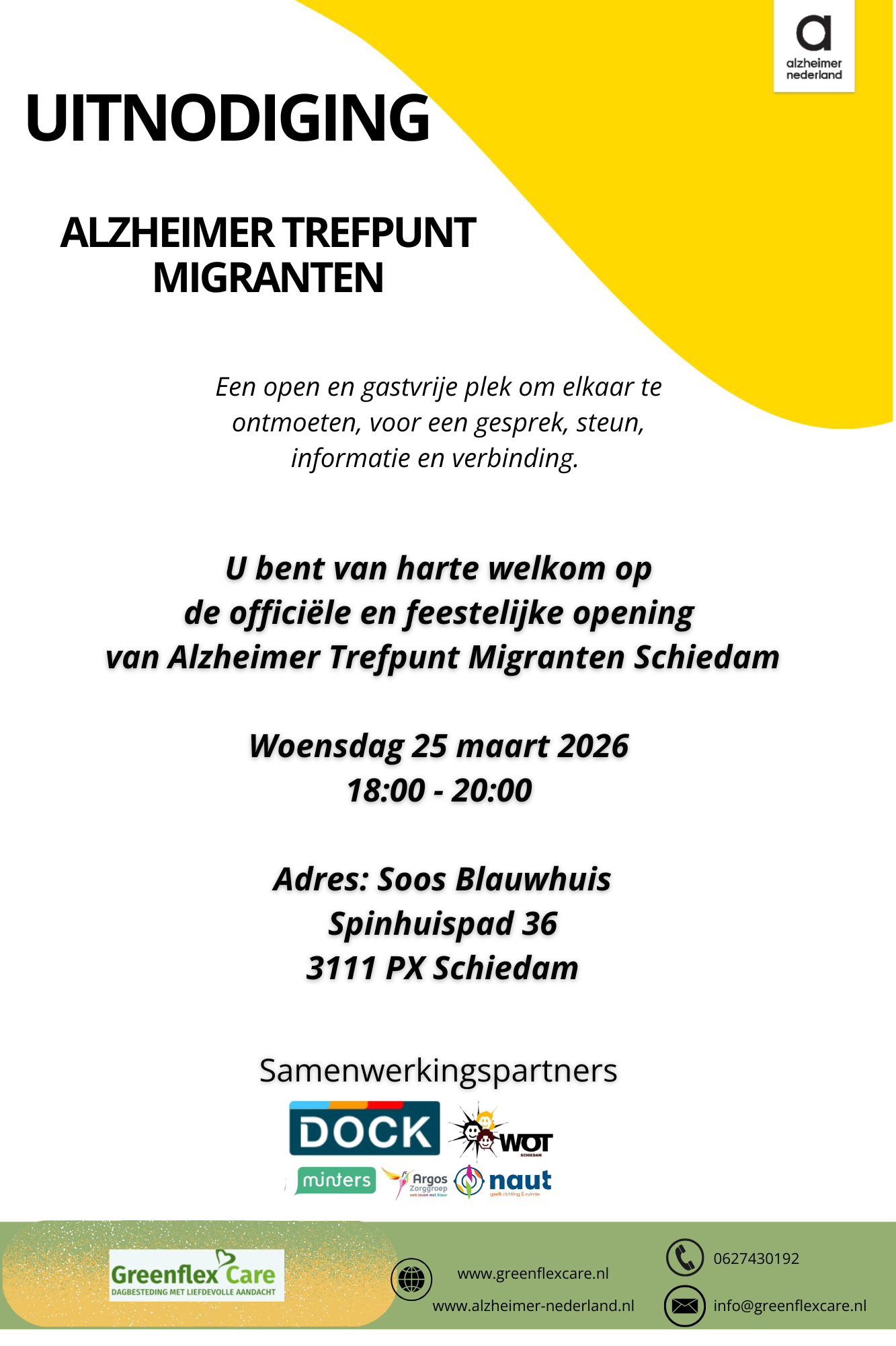 Het Alzheimer Trefpunt is een initiatief van Greenflex Care in samenwerking met Alzheimer Nederland en diverse lokale partners, zoals Minters, Argos, WOT, Naut, SMS en Dock.